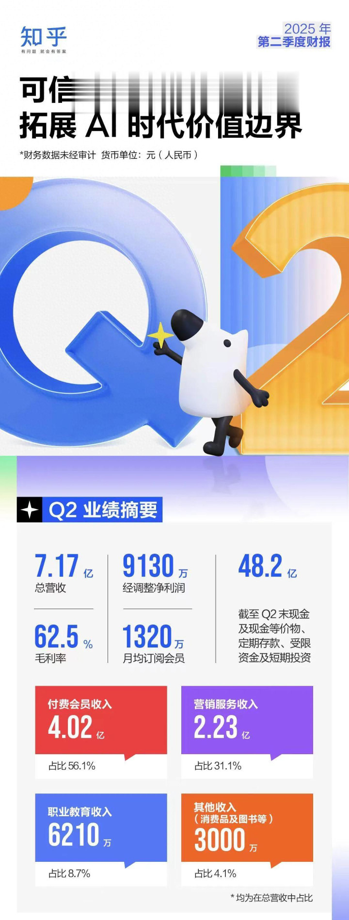 南派资讯:8月27日,知乎(NYSE:ZH;HKEX:2390)发布2025年第二季度功绩论述。论述露出,知乎第二季度营收7.17亿元,经调养净利润9130万元,连气儿三个季度已毕Non-GAAP盈利,大幅高出商场预期。 财务层面,知乎持续安定多引擎营业布局,其中付费阅读业务孝顺4.02亿元营收,占比达到56.1%。营销办事和办事解释业务分离孝顺2.23亿元和6210万元,占比为31.1%、8.7%。 自2024年第四季度初度已毕全面利润转正以来,知乎永恒延续季度性盈利的坚强势头,第二季度经调